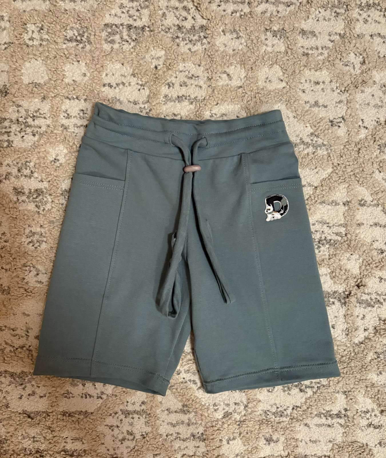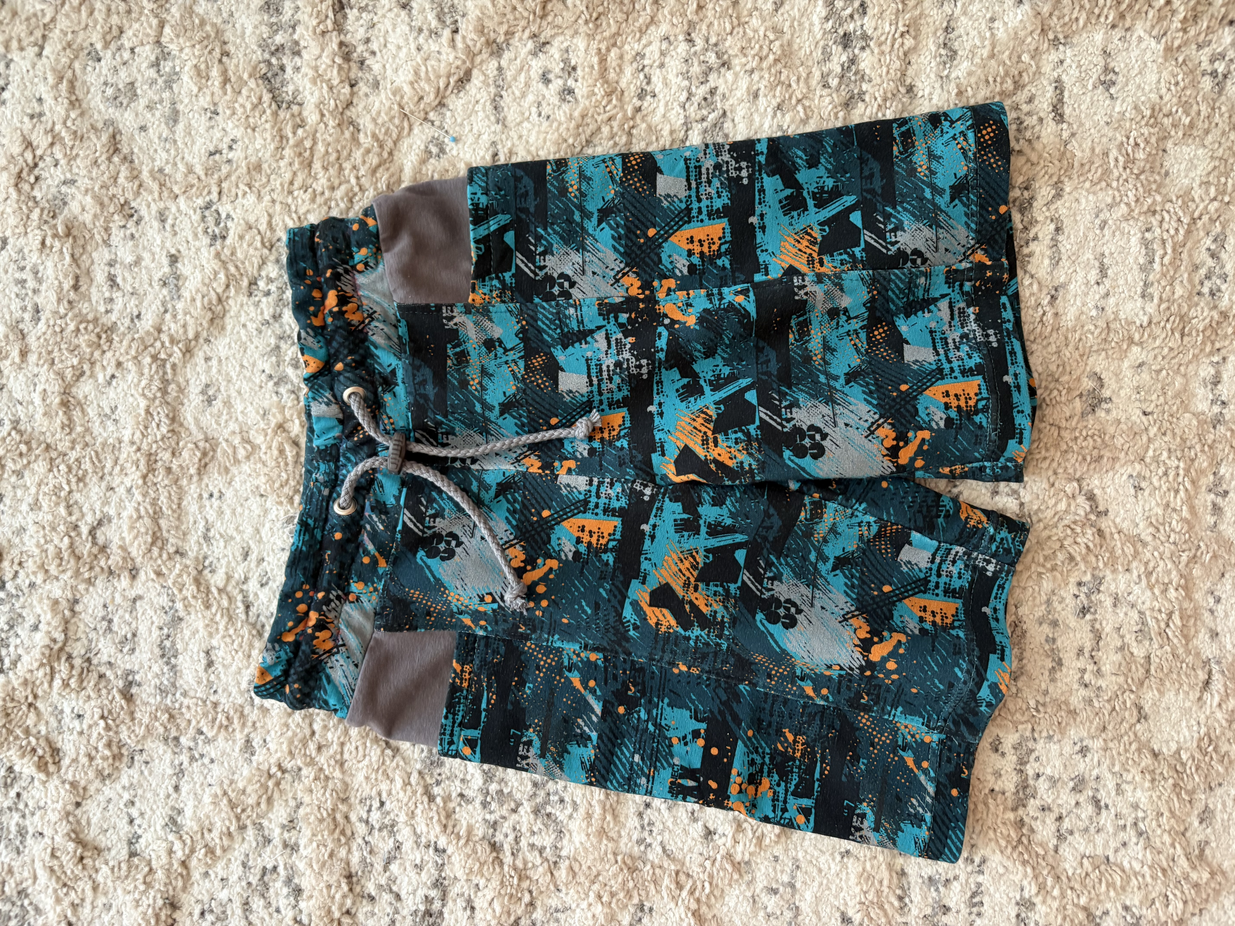 "Druhé šití dle střihu, šila jsem z úpletu, což víc pruží, tudíž šitá velikost 128 odpovídá pro velikost 134, jelikož nositel není k v domě, ušila jsem tři tunýlky na gumu šíře 3 cm, a případně po vyzkoušení gumy povolím nebo zkrátím. " *