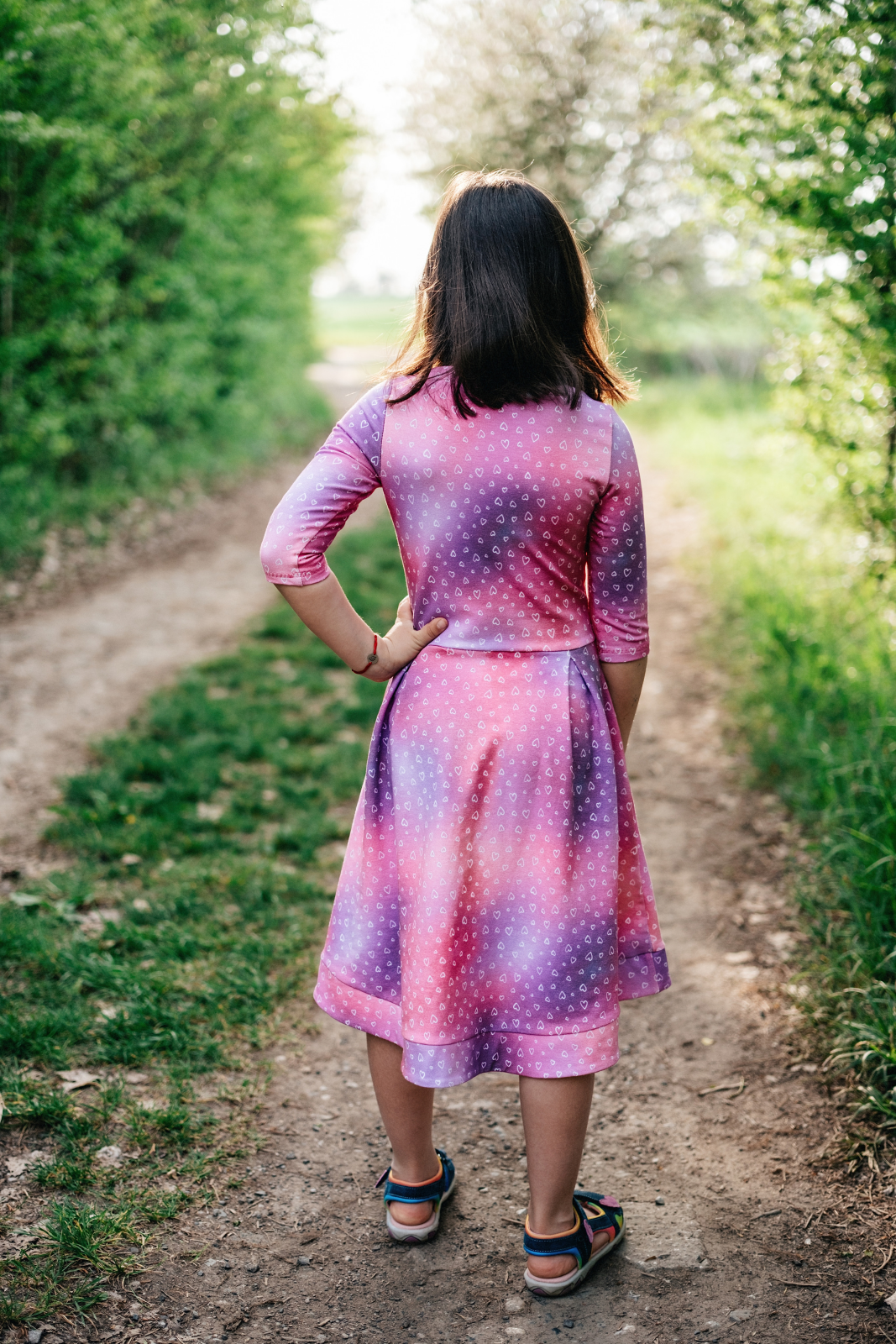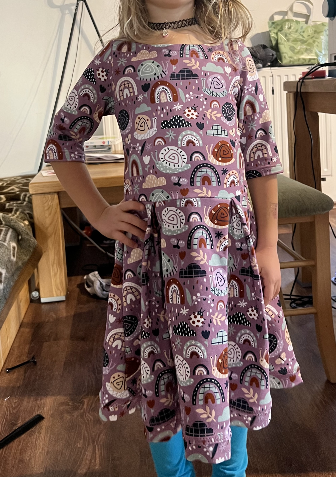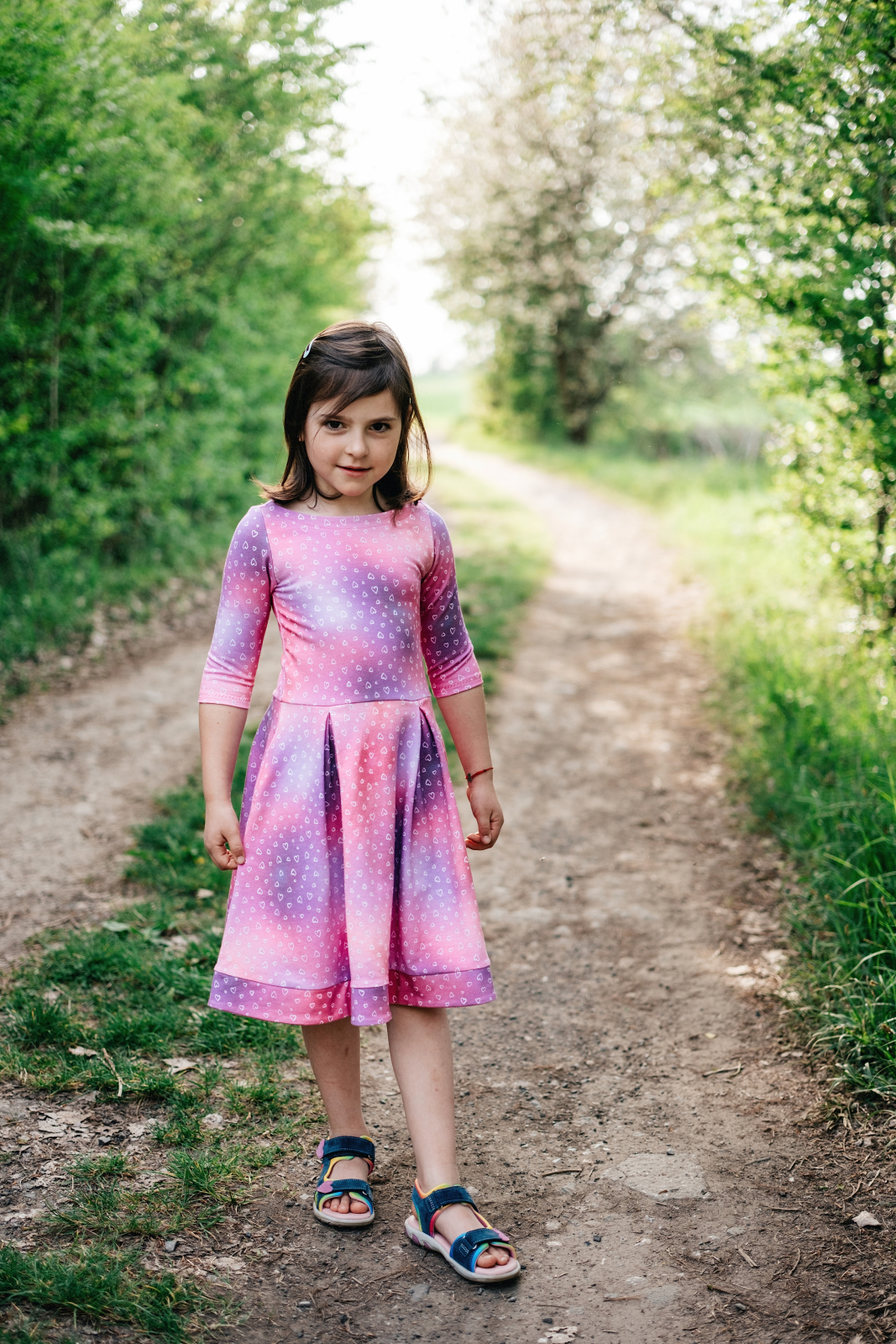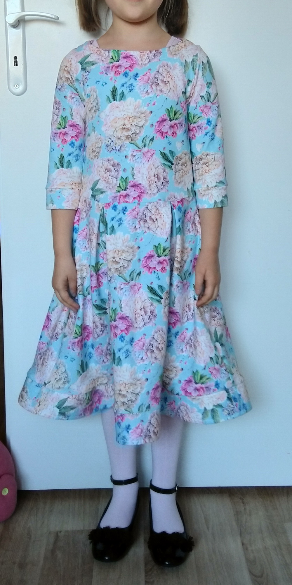 JM: "Dcera je nechce sundat 🙂. Dělá mi to velkou radost, jsou to moje první ušité šaty, poprvé na overlocku a poprvé z úpletu." *