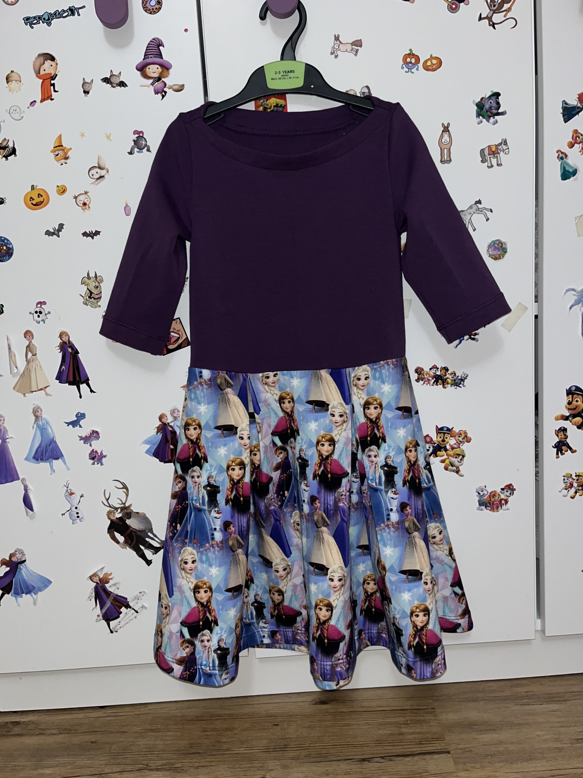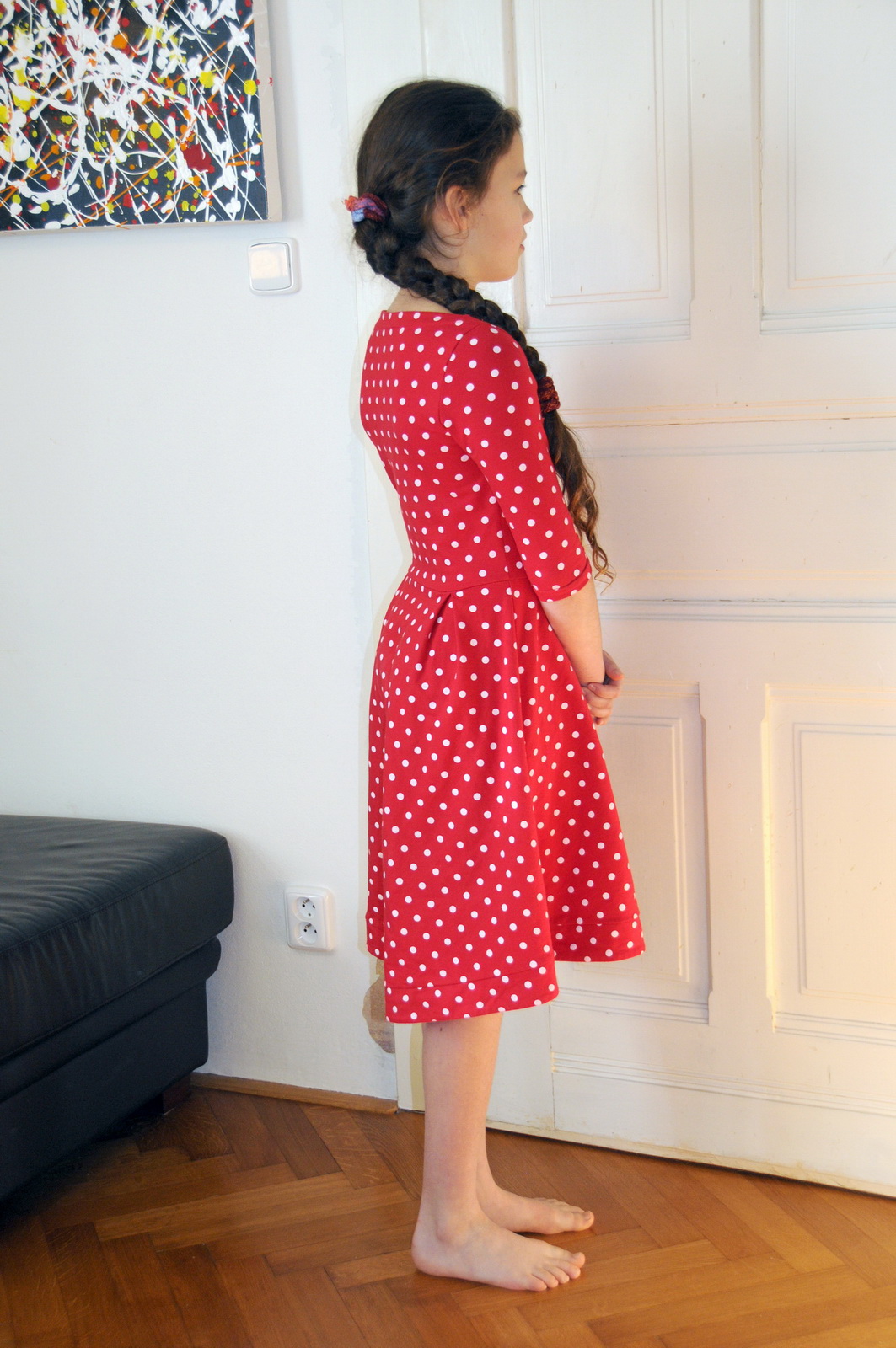 RF: "Môj obľúbený strih v dospeláckej verzii, nuž som musela skúsiť aj tú detskú a to rovno v 2 veľkostiach :) Som nadšená. Aha, áno - predĺžila som rukávy a pridala náplet, kedže to mali byť šaty do školy a škôlky na jeseň-zimu." *