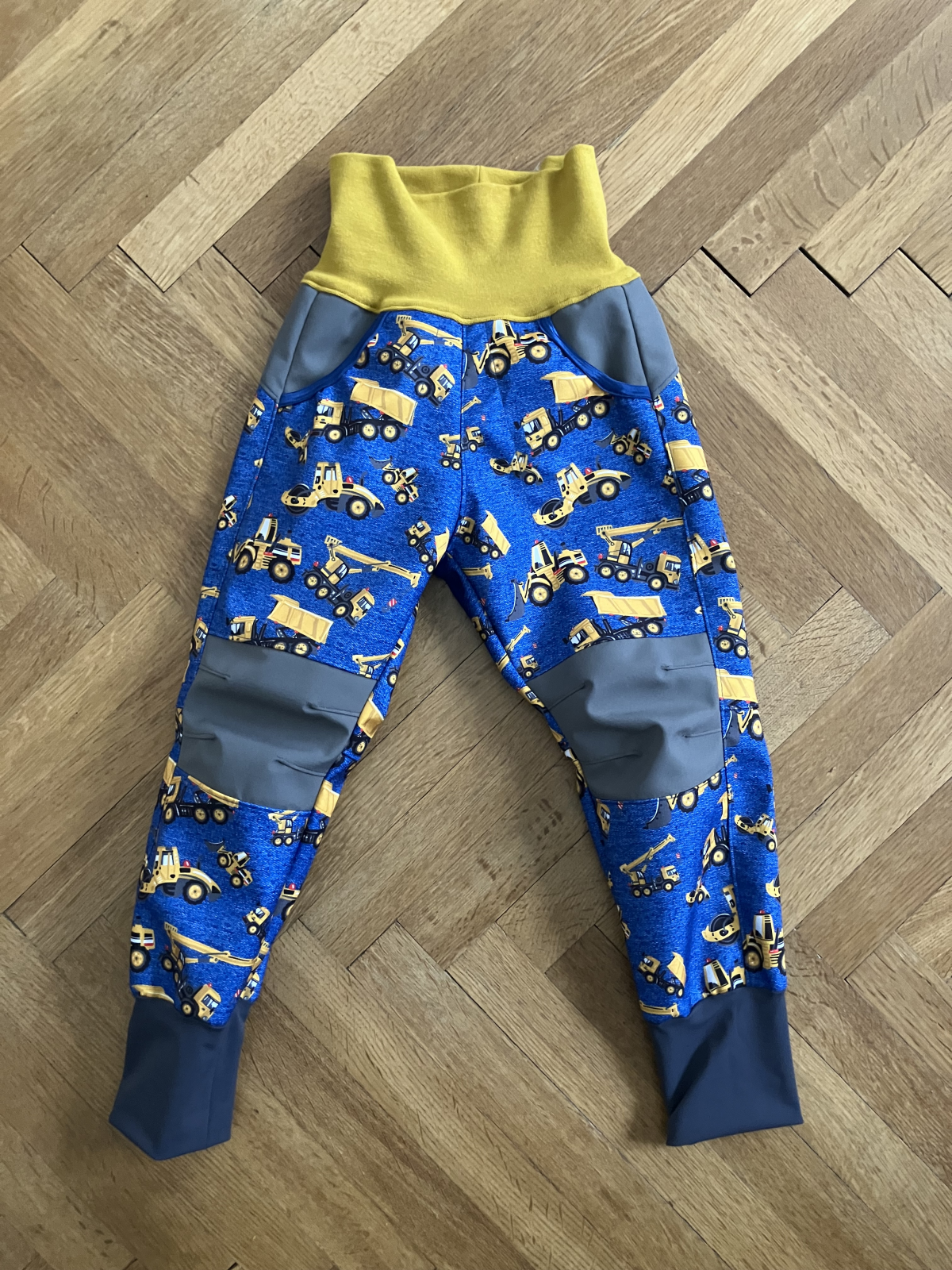 Kalhoty mají kapsy a dolní kraj je zakončen zahnutím, lze zde použít náplet stejně jako v pase nebo lemovací gumičku.