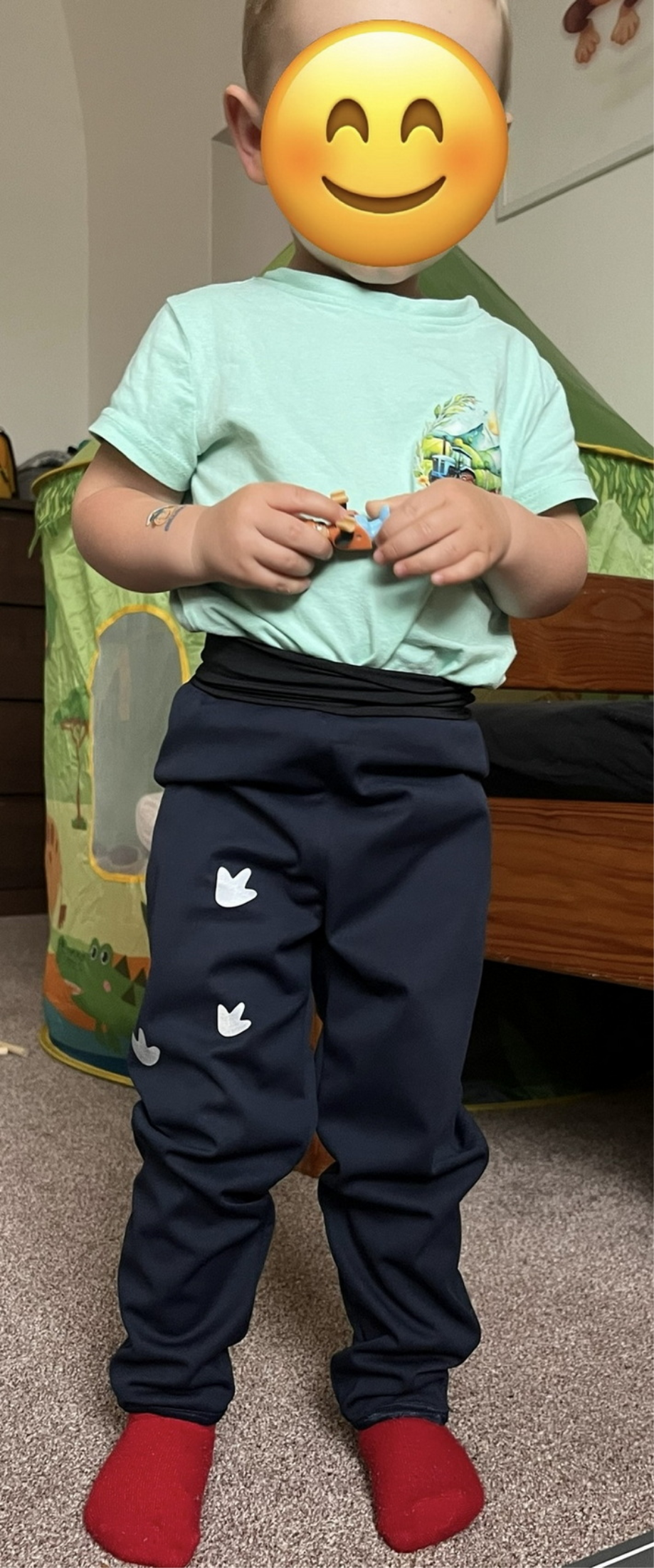 „Mockrát děkuji za skvělý střih a hlavně možnost konfigurace. Na našeho žížaláka beru vždy menší velikost a prodlužuji. Tady jsem to díky konfiguraci měla téměř bez práce. Přidala jsem náplety do pasu i na nohavice. Díky tomu nikam netáhne ani při jízdě na kole. Syn je teď nosí do lesní školky, má už troje :-) Jsou mu pohodlné, nebrání pohybu. Prostě super:-)“