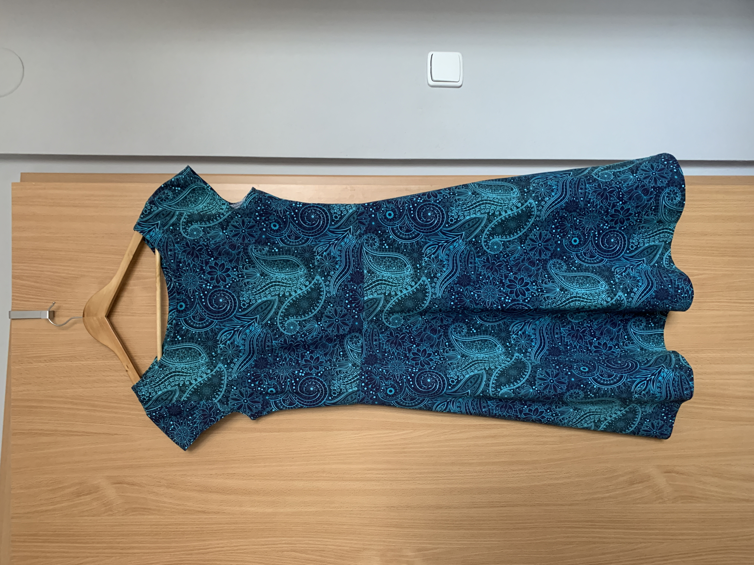 MiNej: "Velká spokojenost. Skvěle padnoucí střih. Držela jsem se malého výstřihu vepředu a většího vzadu - hodně se mně to takto zamlouvá. Výsledek je výrazně odlišný u různých materiálů (např. splývavost), i u různých délek (modré květy o 4 cm delší)." *