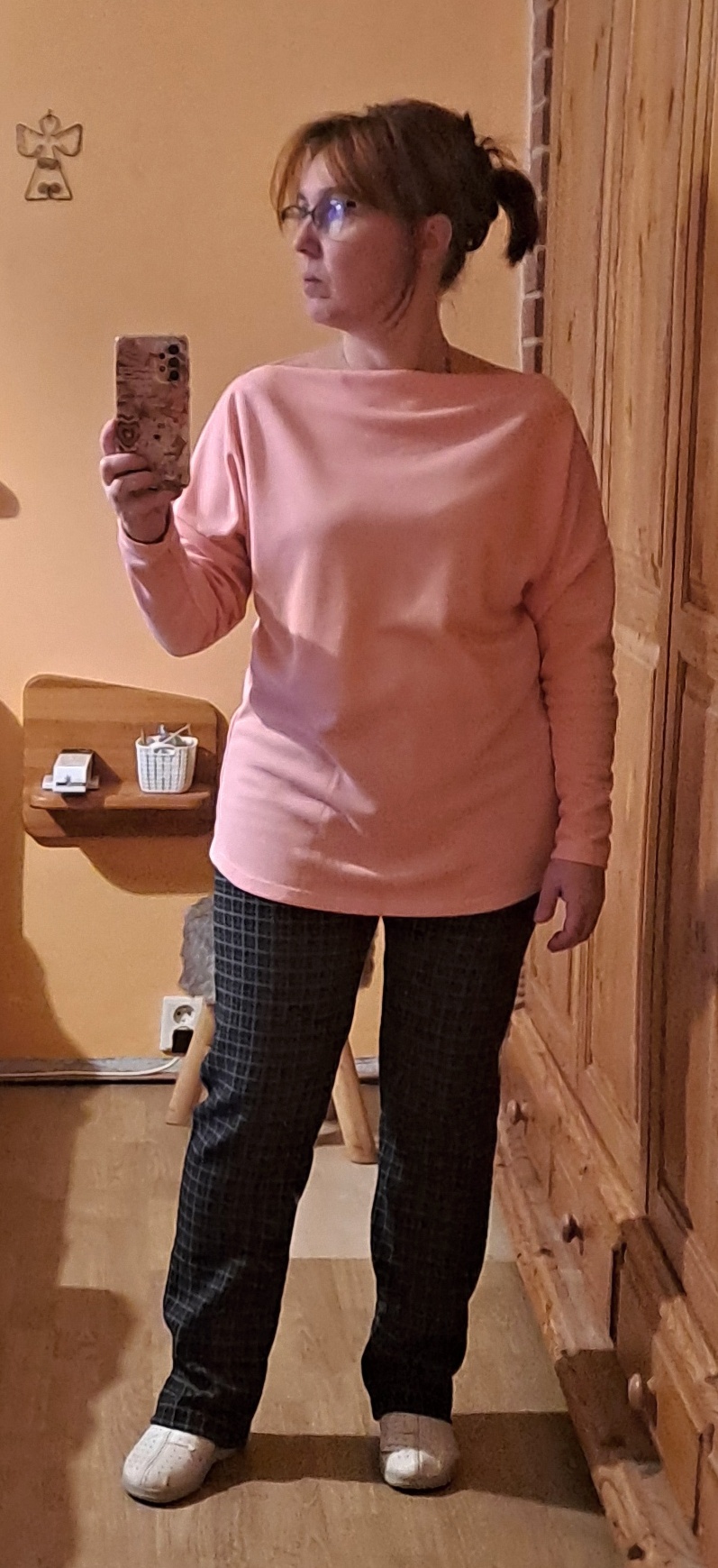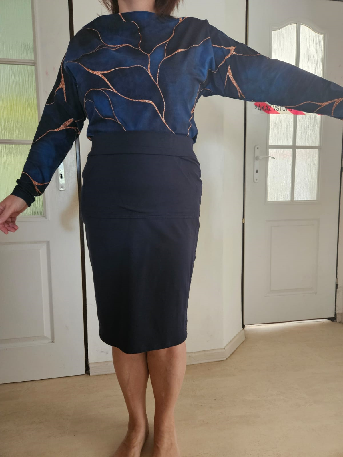 KB: "Strih pěkně sedí, příště bych chtěla zkusit z bavlněné svetroviny, ale možná střihnu o číslo menší, ať mi tak nepadá z ramen (resp ať není ten výstřih tak široký). K sukni se da pěkně podkasat, na fotku jsem jej ale nechávala v originální délce. Svetřík se šil celkem rychle, podsádku jsem nepřišívala a je to úplně v pohodě- upravím po oblečení a pak už drží tam, kde má. " *