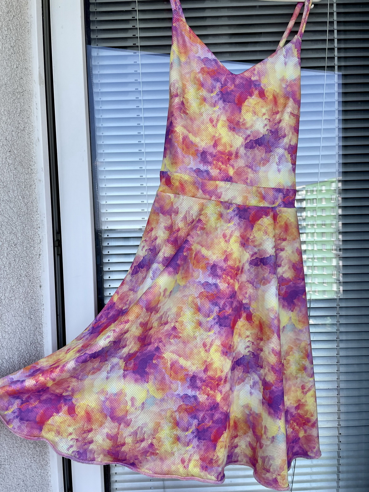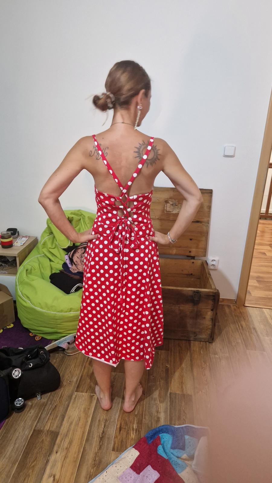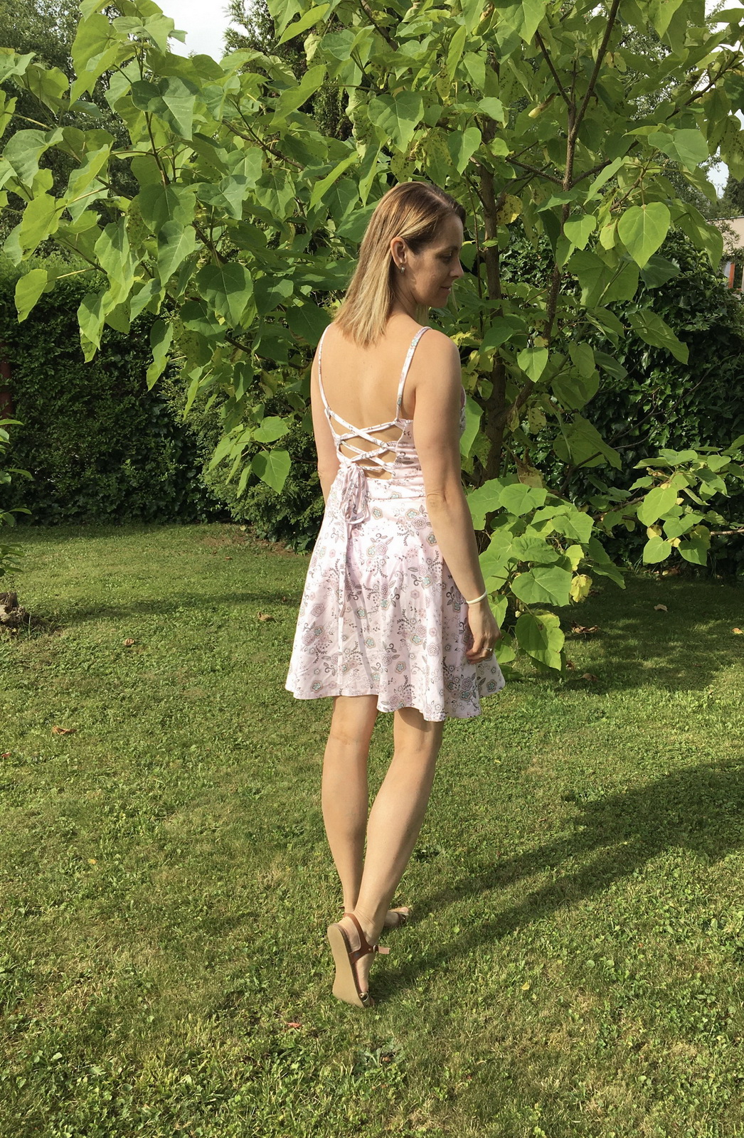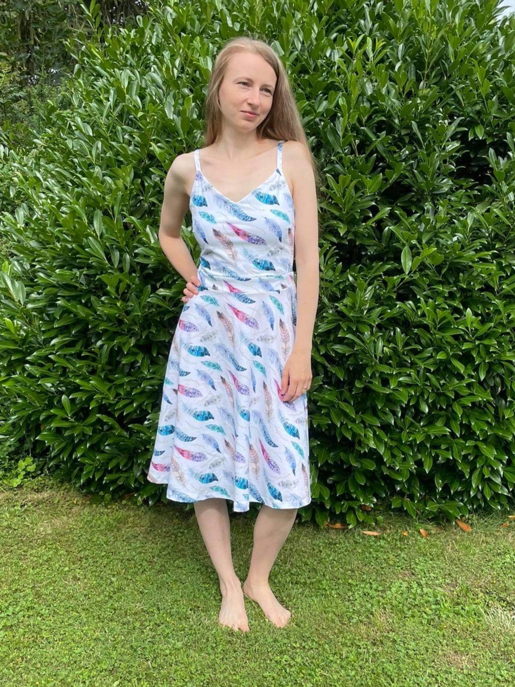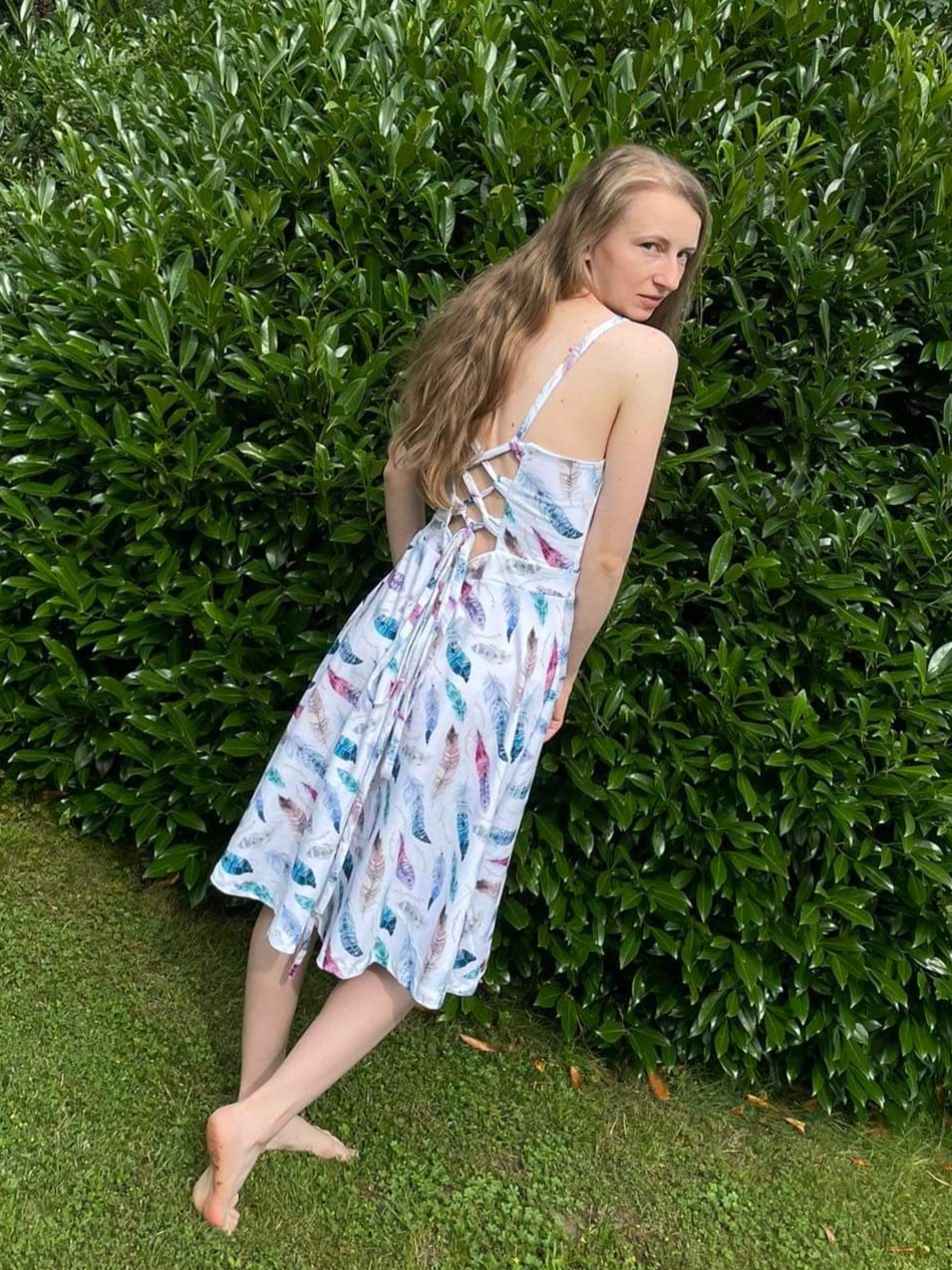 „Šití jsem se nejdřív bála, pač jsem si vymyslela jiná záda, ale do finále jsem nadšená. Podle návodu se opět šilo krásně a snadno. Protože bez podprsenky ani ránu 😅, zvolila jsem místo šněrování na zádech žabičkování a z toho důvodu i širší ramínka. Ráda nosím sukně nad kolena, takže moooc chválím zakreslení zkrácené verze sukně již ve střihu👏🏼. Na sukni jsem si dovolila ještě rozparek 😊.“