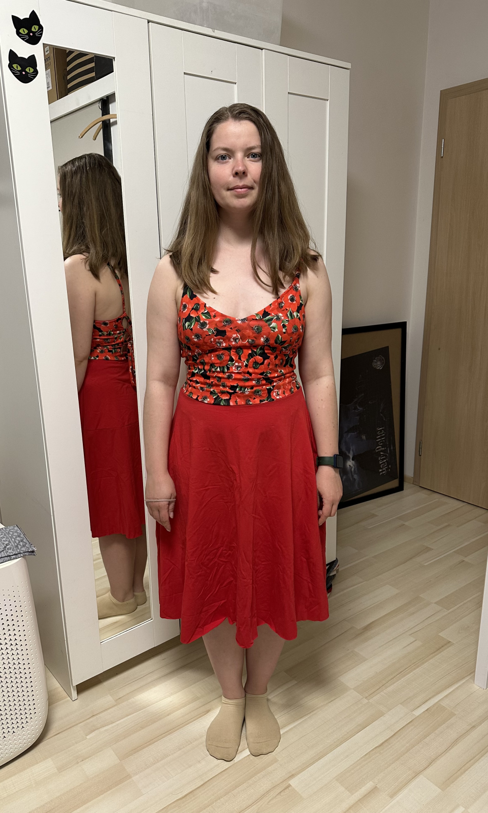 Jelikož mám dost netypickou postavu (žádná prsa, žádný pas 🤭😂), vršek jsem si poupravovala na vel. 40/42, spodek je 42. Nicméně trošku jsem to přestřelila, čistá 40 by v pohodě stačila. Sukni jsem střihla přesně na délku delší sukně (bez přídavku na záložku) a zahla o 3cm.