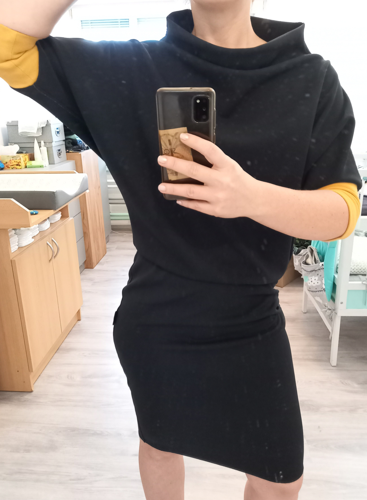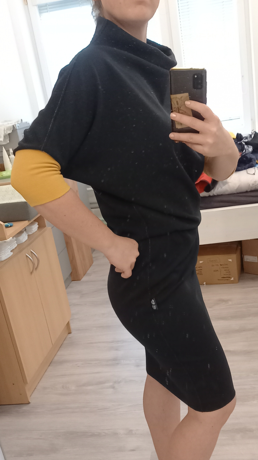 „Střih je bezvadný, na ušití rychlovka, šaty jsou slušivé. :) Zvolila jsem splývavější materiál, takže je vršek volnější, příště raději teplákovinu. I přesto šaty velmi ráda nosím.“