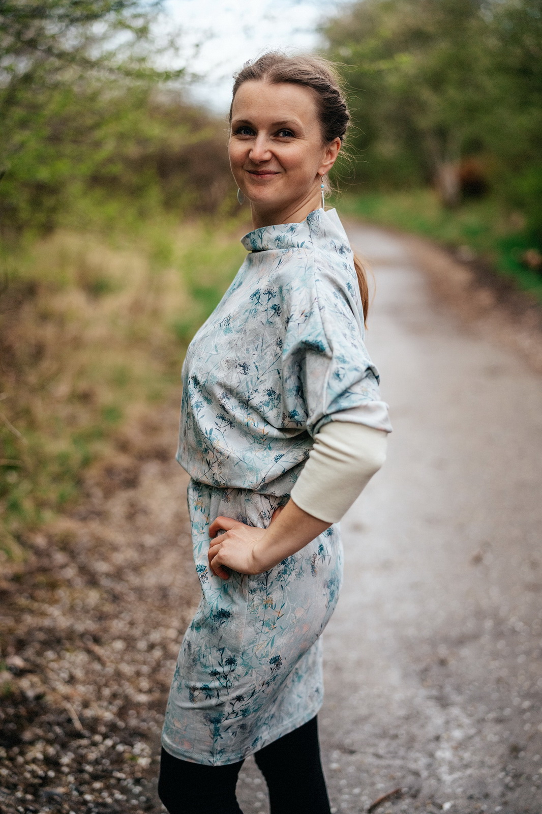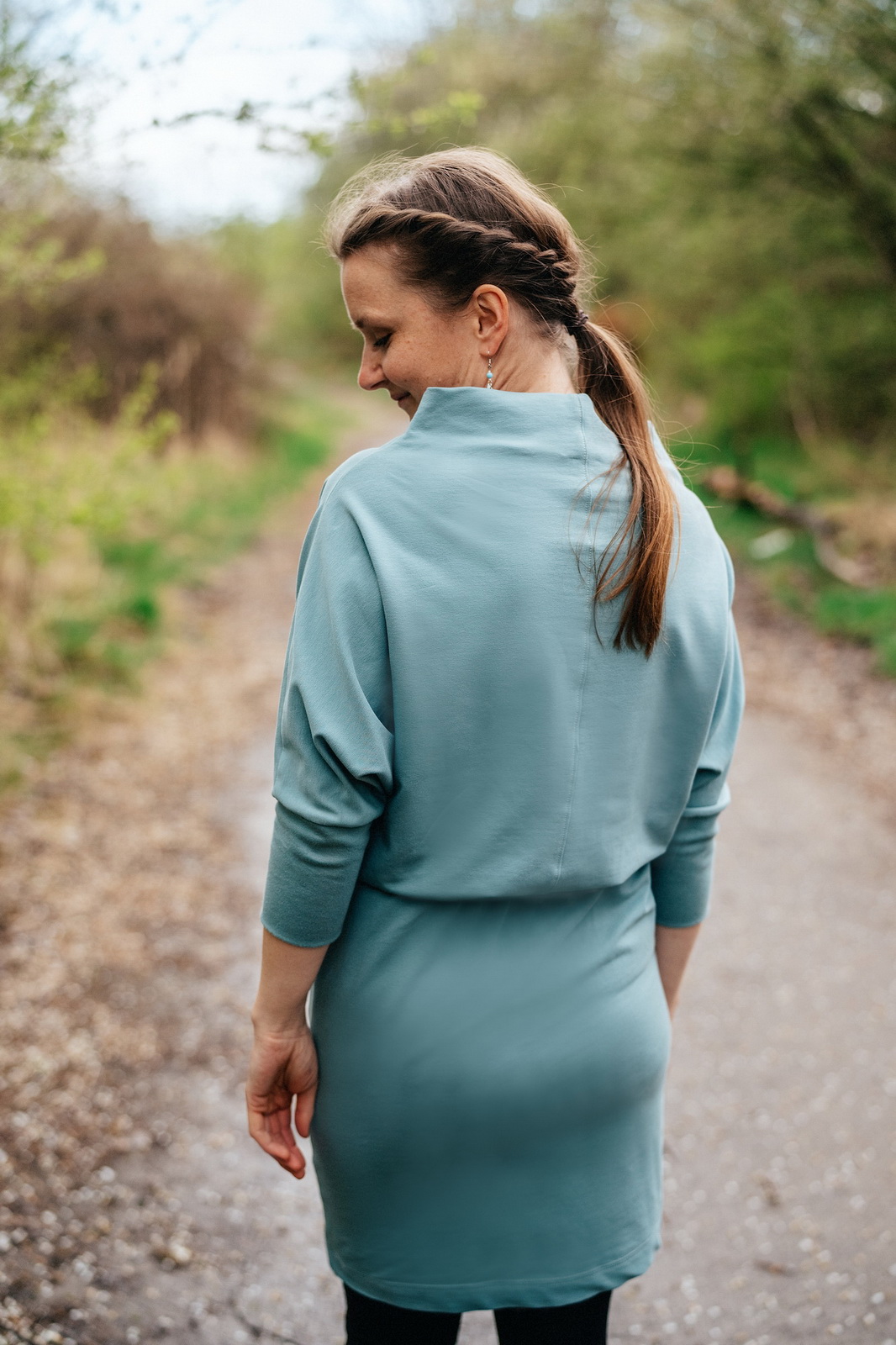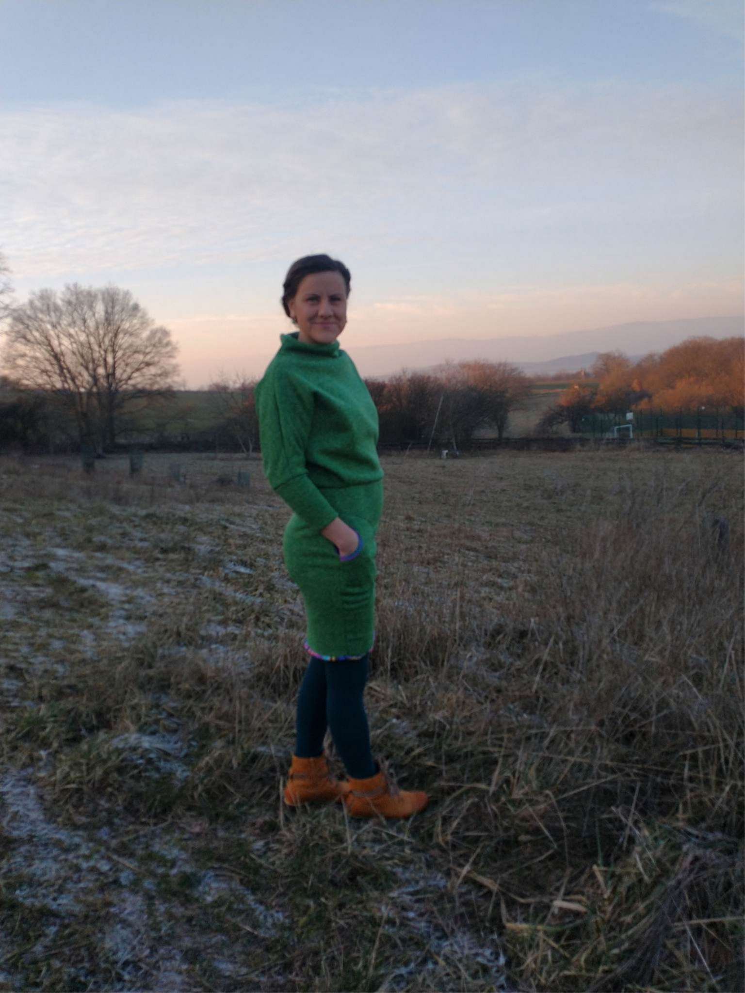 Šaty Ilona jsou úžasným kouskem, jsou ušité z teplákoviny a tak se hodí od podzimu do jara. Vrchní díl - živůtek, je příjemně volný a pohodlný, krk je řešený efektivním stojáčkem. Volné rukávy jsou na konci všity do manžety pro větší komfort.
