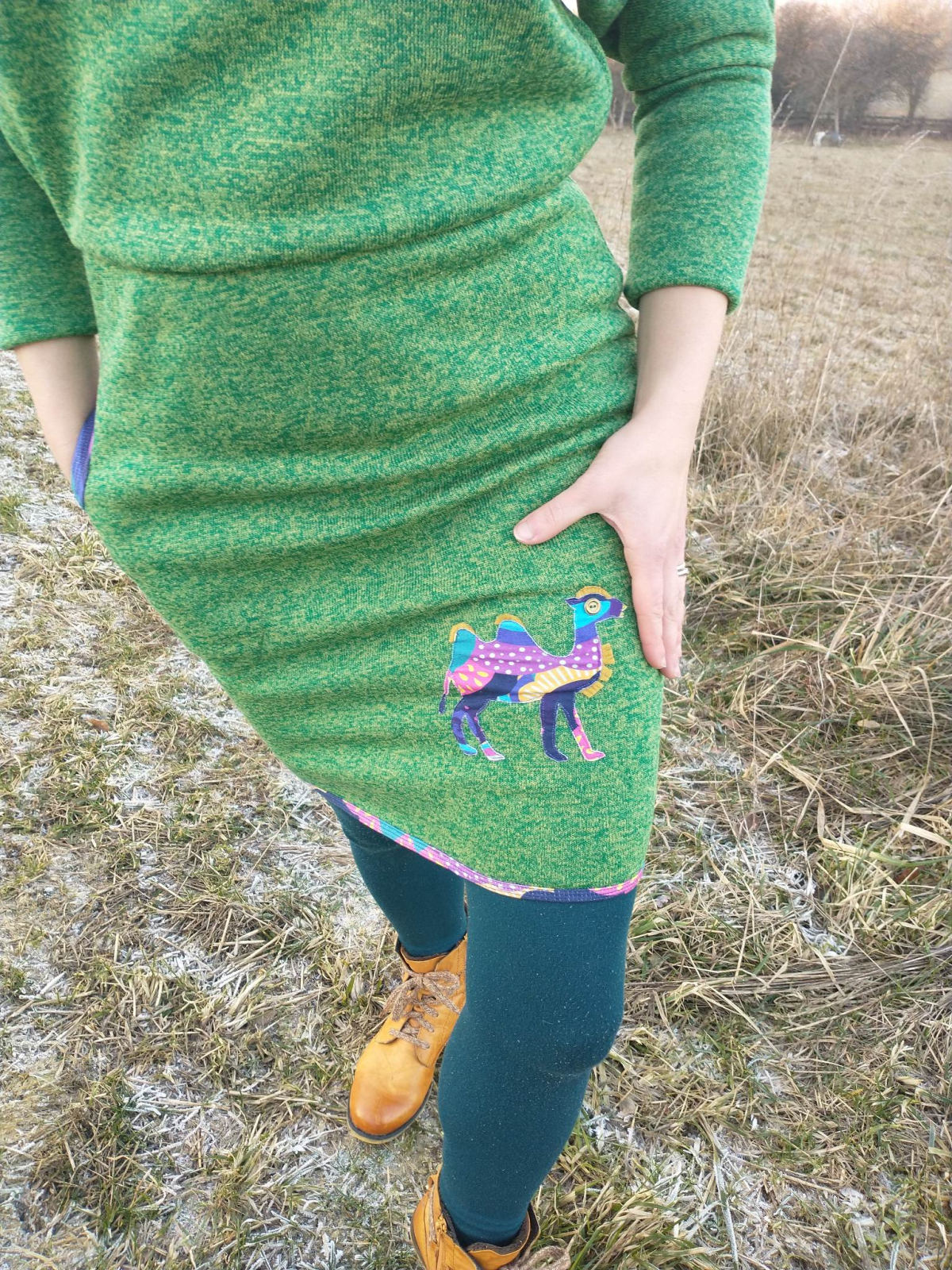 „Zkusila jsem šít z materiálu, který není pro tyto šaty úplně doporučen - ze svetroviny. Ona taky trochu pruží, tak se mi v tom hýbe a cítí dobře. Přidala jsem si jednu kapsu a velblouda, spodní okraj sukně jsem olemovala. Jinak je to bez úprav, šilo se mi to moc hezky, děkuji za skvělý střih i návod!“