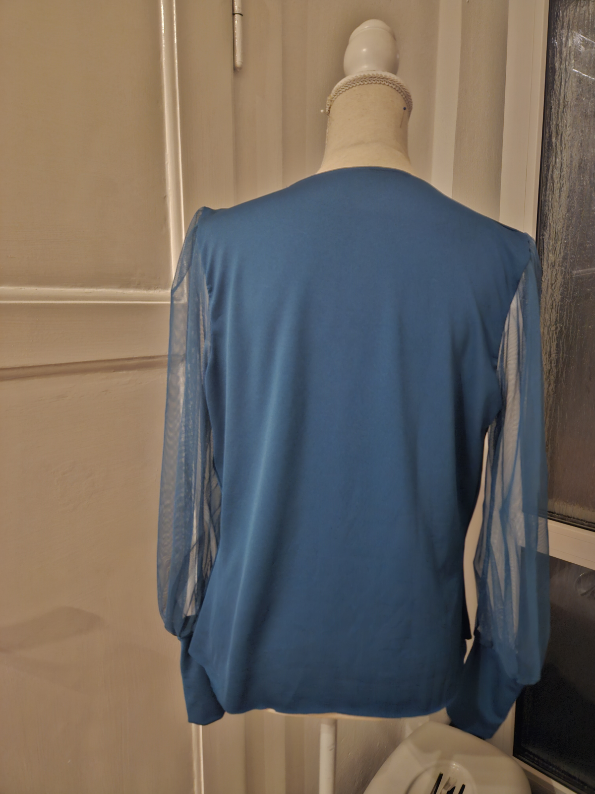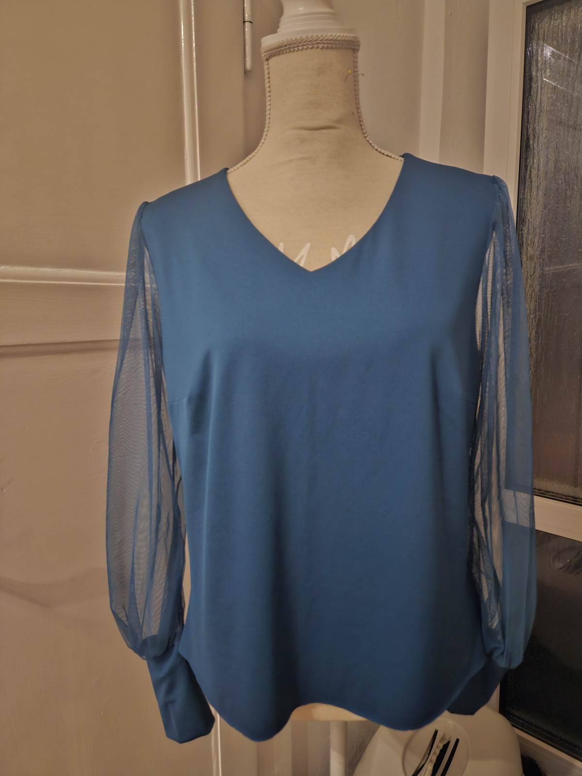 VD: "Se střihem se pracovalo moc hezky. Vynechala jsem přeložku předního dílu a vypracovala vnitřní část předního dílu s délkou pouze pod prsa. Dost mě potrápilo sesazení předního a zadního dílu v náramenici. Manžetu bych příště střihla o malinko širší, aby nebyla tak upnutá. Délku jsme si o pár centimetrů protáhla."
