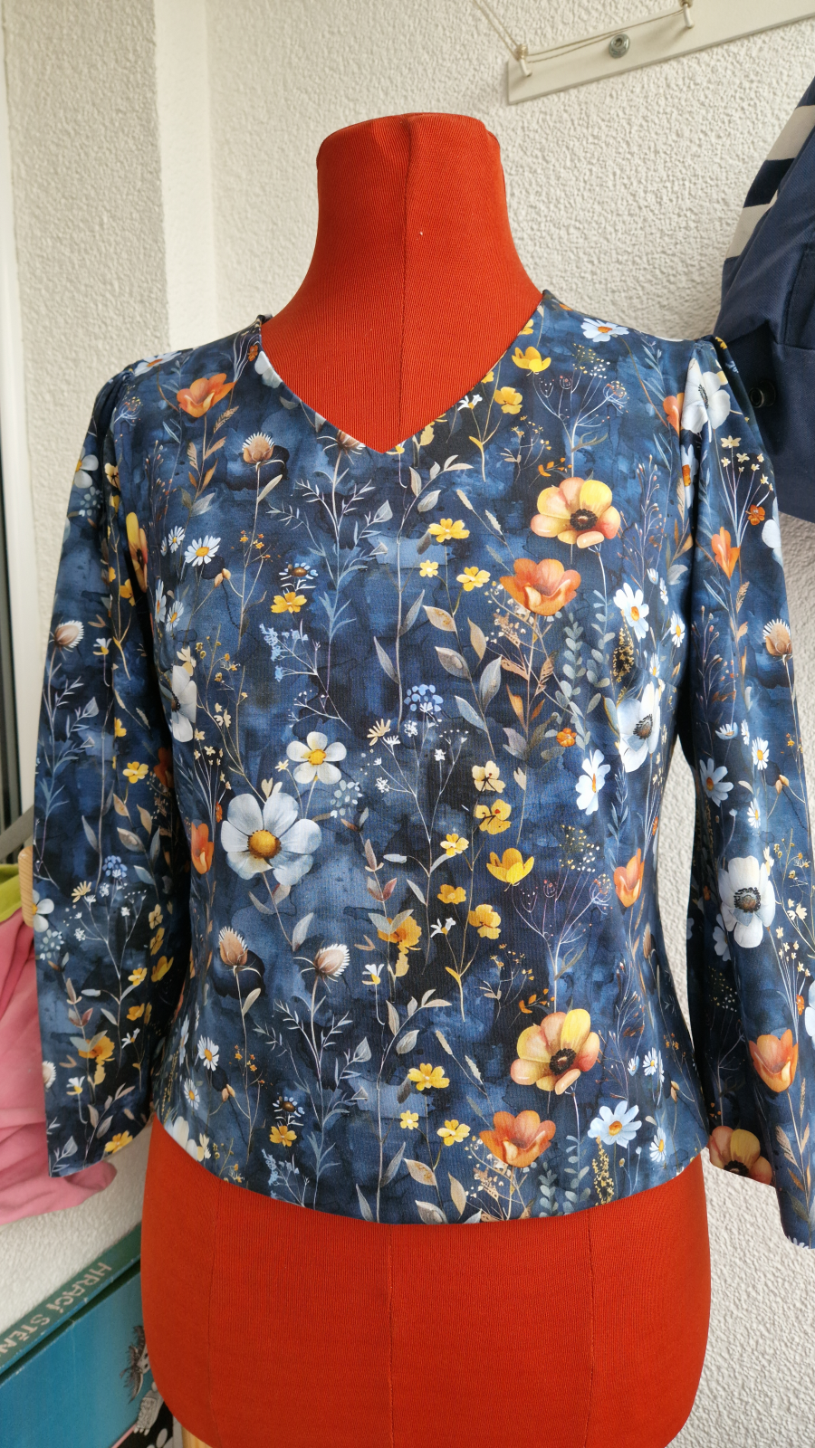 „Se střihem se pracovalo moc hezky. Vynechala jsem přeložku předního dílu a vypracovala vnitřní část předního dílu s délkou pouze pod prsa. Dost mě potrápilo sesazení předního a zadního dílu v náramenici. Manžetu bych příště střihla o malinko širší, aby nebyla tak upnutá. Délku jsme si o pár centimetrů protáhla.“
