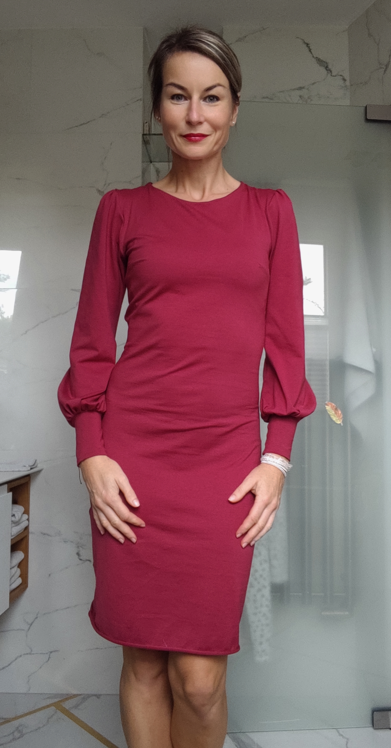 Zuzana : "Strih je opäť super. Šilo sa výborne. V strihu je zmena, nakoľko som šila z teplákoviny, spodný okraj je začistený zahnutím a vrch prúžkom zvnútra, rovnako ako na šatách Linda. Preto mi vznikli sklady na ramenách 😊" *