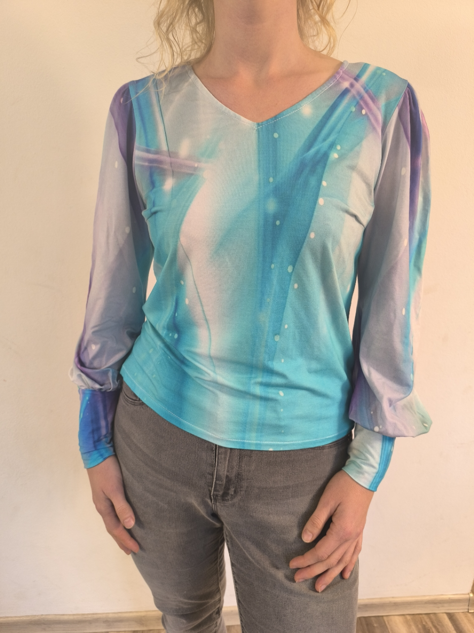 VD: "Se střihem se pracovalo moc hezky. Vynechala jsem přeložku předního dílu a vypracovala vnitřní část předního dílu s délkou pouze pod prsa. Dost mě potrápilo sesazení předního a zadního dílu v náramenici. Manžetu bych příště střihla o malinko širší, aby nebyla tak upnutá. Délku jsme si o pár centimetrů protáhla." *