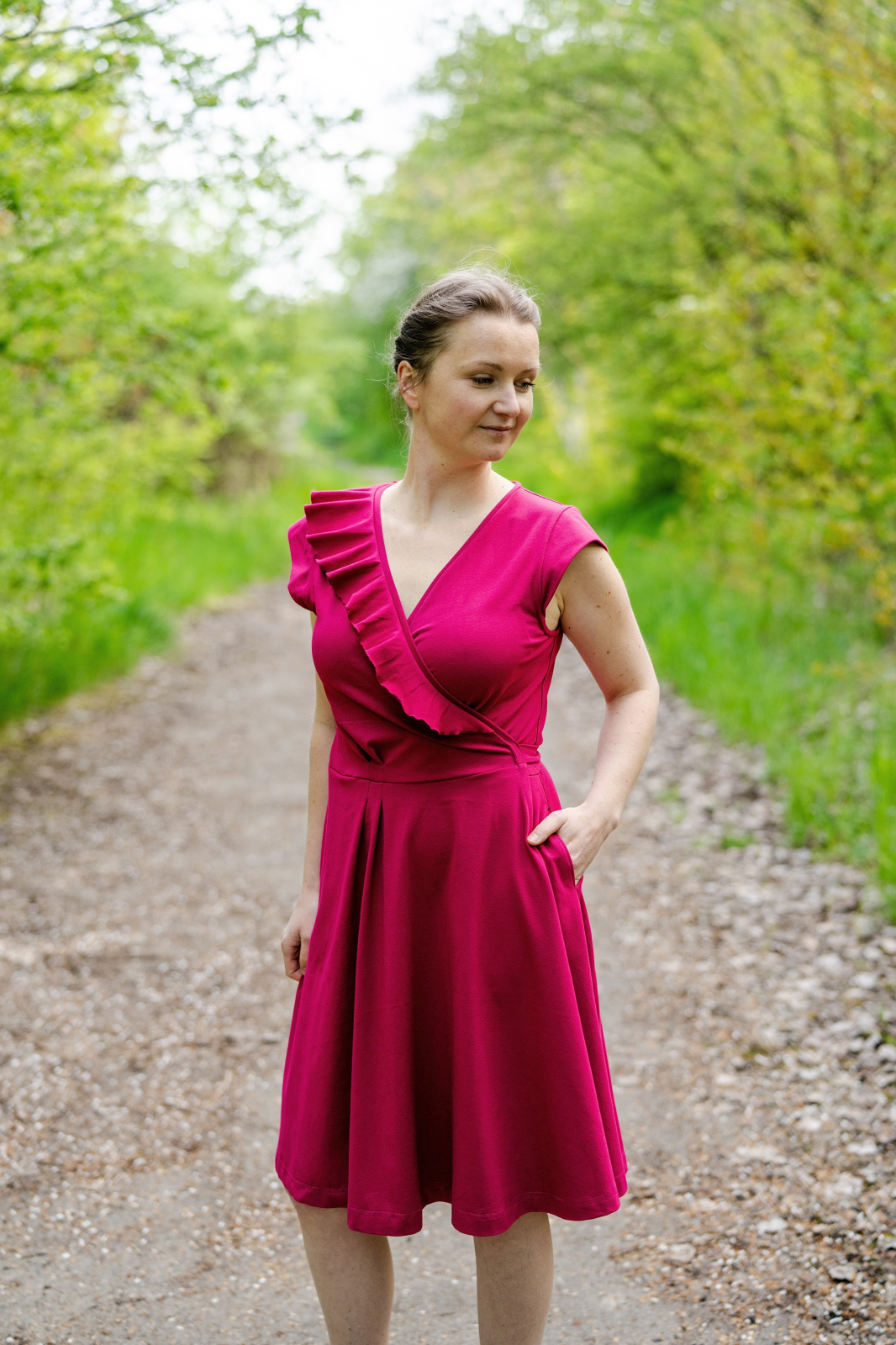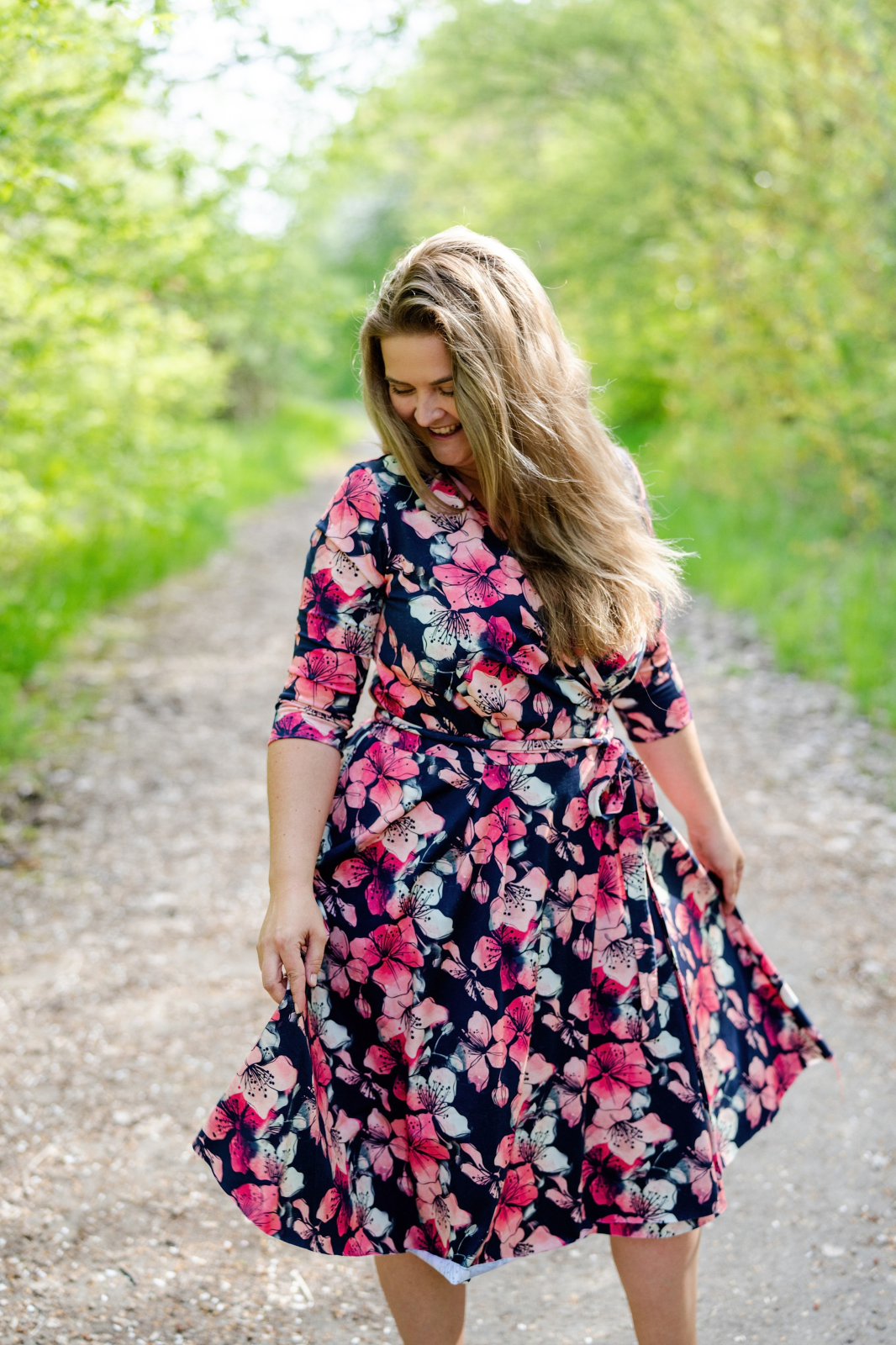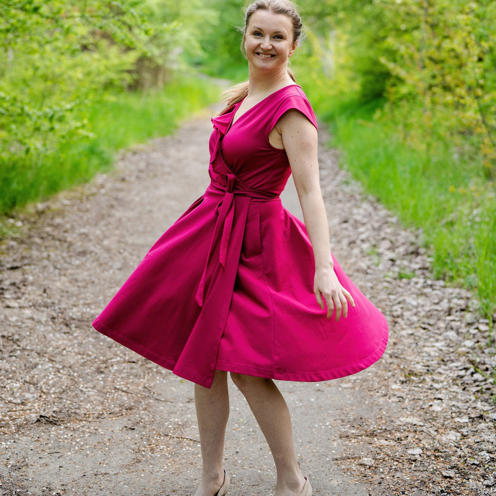 JK: "Na zavinovací šaty jsem se dlouho chystala, ale měla jsem strach, že je nezvládnu ušít. Když holky ze Živých střihů vytvořily nový střih, byla jsem nadšená a věděla, že se do nich konečně pustím. A ještě je budu mít přesně na svou postavu. Zvolila jsem levnější funkční úplet. Šila jsem dle videonávodu krůček po krůčku a poctivě zažehlovala. Šilo se mi dobře a mám z nich velkou radost a moc ráda je nosím. Moc děkuji za vaši práci." *