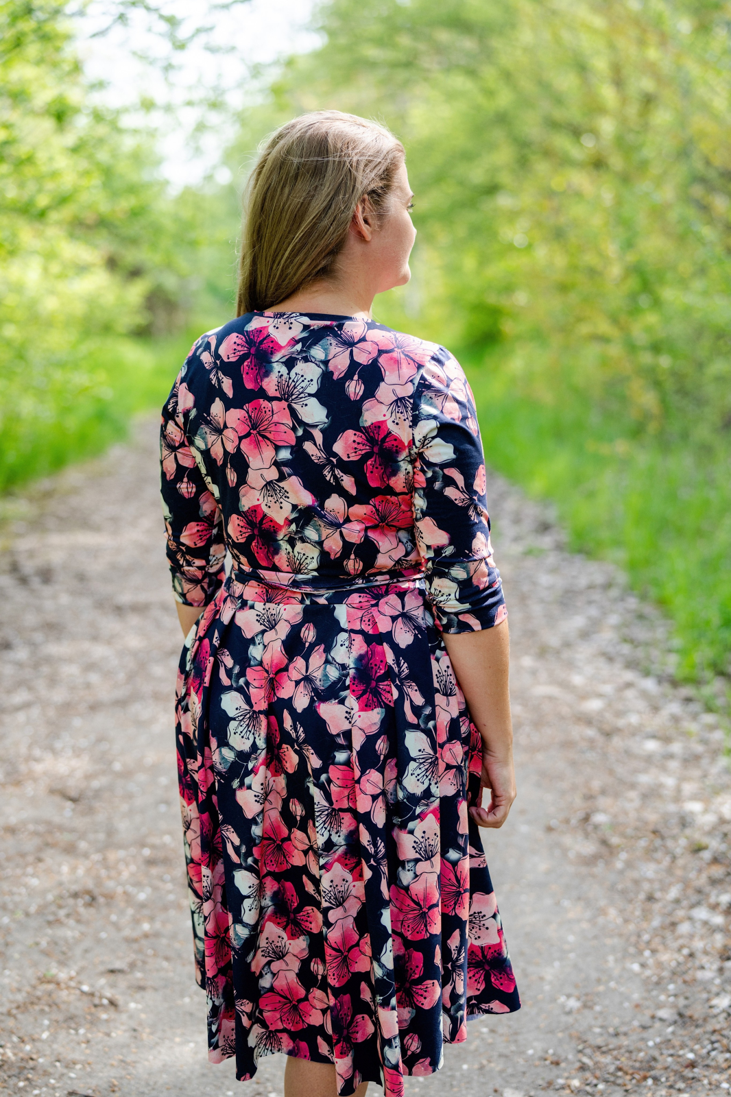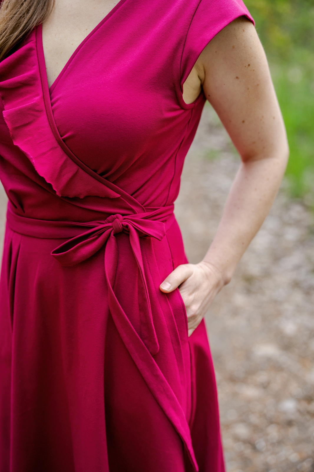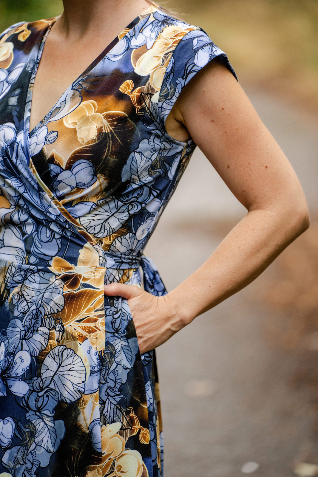JK: "Na zavinovací šaty jsem se dlouho chystala, ale měla jsem strach, že je nezvládnu ušít. Když holky ze Živých střihů vytvořily nový střih, byla jsem nadšená a věděla, že se do nich konečně pustím. A ještě je budu mít přesně na svou postavu. Zvolila jsem levnější funkční úplet. Šila jsem dle videonávodu krůček po krůčku a poctivě zažehlovala. Šilo se mi dobře a mám z nich velkou radost a moc ráda je nosím. Moc děkuji za vaši práci." *