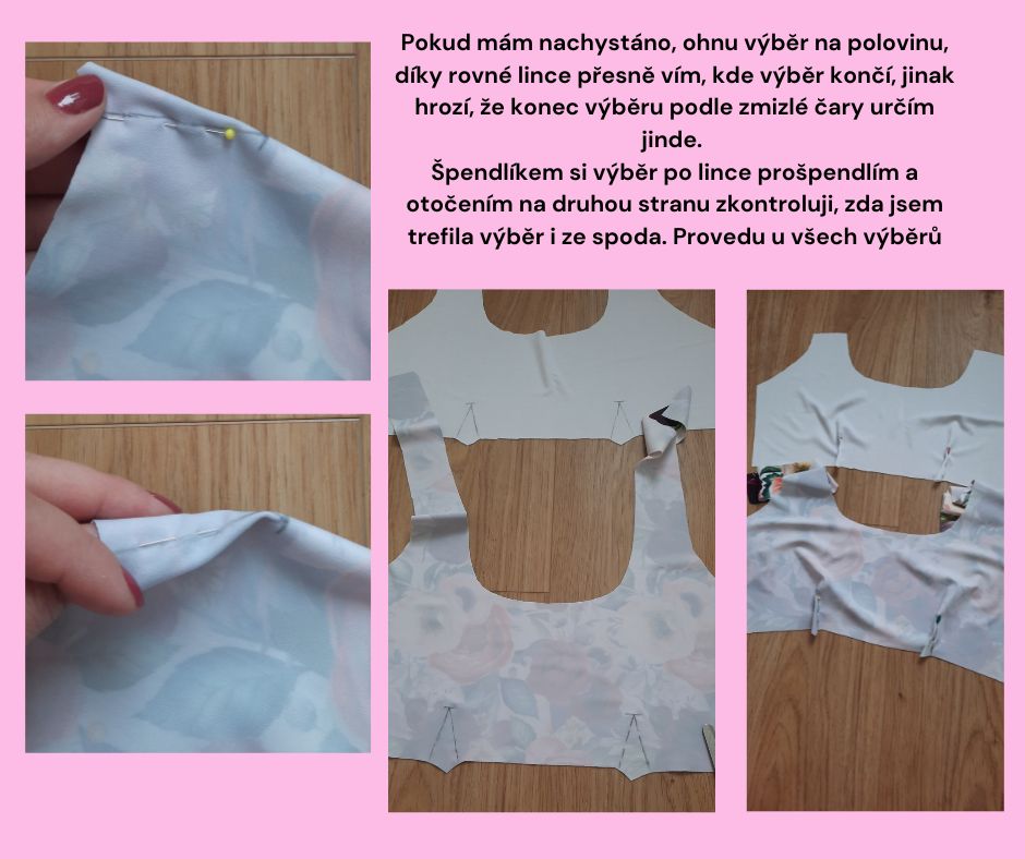 Špendlíkem si výběr po lince prošpendlím a otočením na druhou stranu zkontroluji, zda jsem trefila výběr i ze spoda. Provedu u všech výběrů