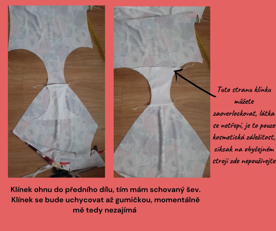 Sešijeme boční švy, špičky švové záložky přesahují, jako minule, je to v pořádku. Šev na zadním díle by měl v boku přesně navázat na šev podprsenky. V boku na sebe pasují nástřihy, od nich špendlím