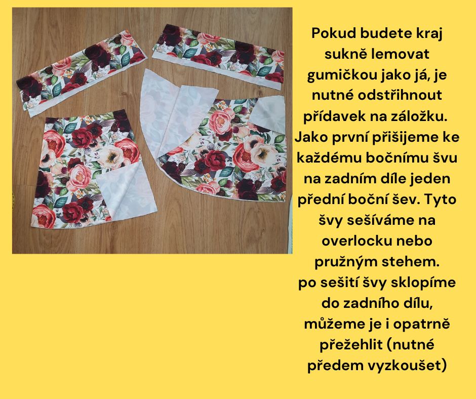 Pokud budete kraj sukně lemovat gumičkou jako já, je nutné odstřihnout přídavek na záložku.
