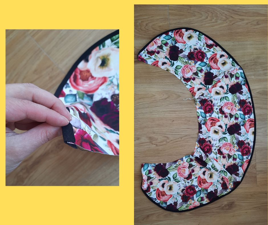 Jako první přišijeme ke každému bočnímu švu na zadním díle jeden přední boční šev. Tyto švy sešíváme na overlocku nebo pružným stehem. Po sešití švy sklopíme do zadního dílu, můžeme je i opatrně přežehlit (nutné předem vyzkoušet)