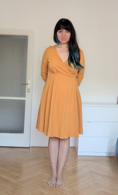 ŠM: „Šaty jako takové jsem šila poprvé ....na dceru, která se nechtěla moc měřit... tak jsme měly příliš úzký rukáv, musely jsme ho zkrátit, aby neškrtil (příště budeme více měřit a konfigurovat). Nechtěla zvětšovat prsní záševky, aby měla pod prsy volno.... Návod je super... zvládla jsem ušít svoje první šaty, moc děkuji. Jen nevím proč, ale přední díl sukně mi asi vyšel zrcadlově, tak má zavinovaní také zrcadlově, ale to nevadí. “