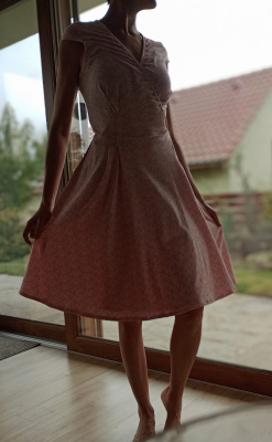 „Trochu jsem si, vzhledem k pružné látce, zmenšila živůtek a na sukni vzadu přidala jeden pár skladů. Šilo se mi dobře. Jen kapsy mě potrápily. Musela jsem párat a z blízka se najdou chybky. “