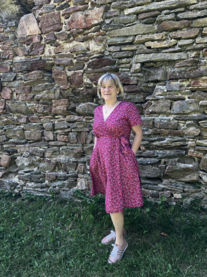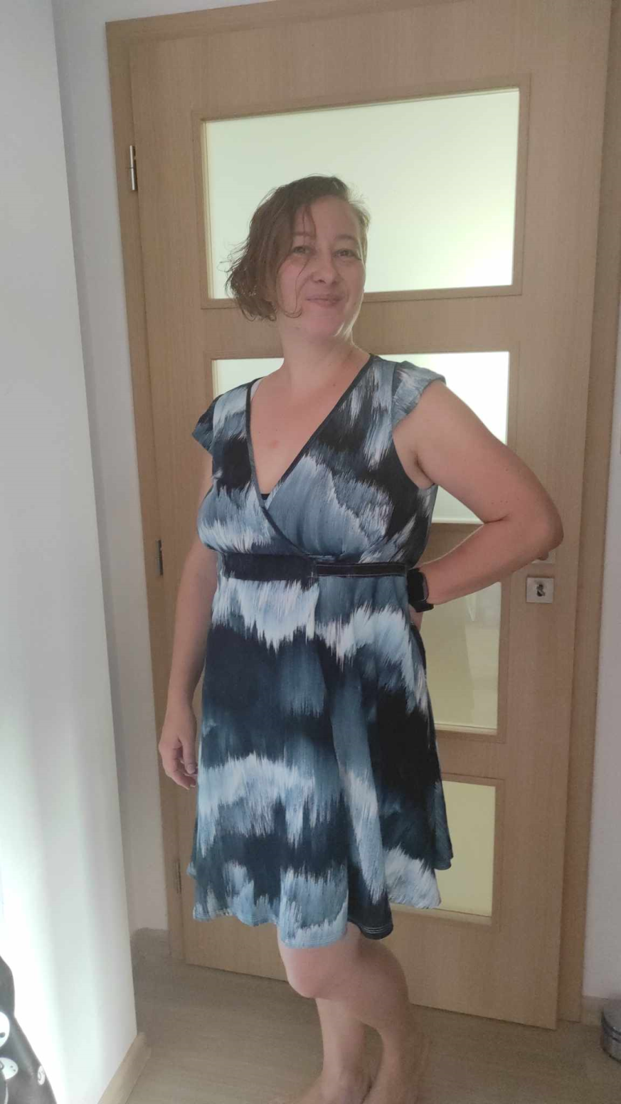 ZB: „Zkrácen vrchní díl, aby se křížilo pod prsy. Do dalšího střihu prodloužím o cca 1cm. Silo se dobře, jen to není styl šatů, kde sednu a je za 2h hotovo. Je potřeba počítat a určitým časem, který se vyplatí. Viskóza je na šití živá a chce opravdu hodně žehlit. Návod je krásně srozumitelný, nebyl žádný problém 🙂“