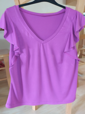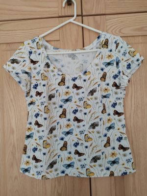 MF: „Střih i videonávod opět dokonalý!!! Nejvíc zabrat mi dala látka, protože opravdu hooooodně pruží, vytahuje se do všech stran... Problém jsem měla se šitím čtyř vrstev na overlocku. Nic mi sice nevyjelo, ale můj obyčejný overlock z Lidlu s tím měl trošku problém. Nakonec triko celkem sedí, na léto opravdu fajn. Mám pokušení vyzkoušet i lehoučký bavlněný úplet, se kterým by se možná pracovalo o dost lépe. Jen váhám, zda na tento střih už nejsem moc stará. “