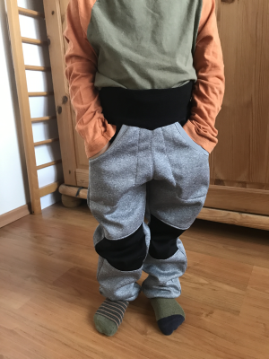 AD: „Šila jsem pro vnoučka, kalhoty se šily parádně, jen jsem malinko rozšířila kolenní část (zarovnala projmutý střed). Před časem jsem šila menší velikost pro vnučku a připadalo mi, že ta kolena jsou po odšití záševků více projmutá, proto jsem u klučičích rozšířila kolenní část. “