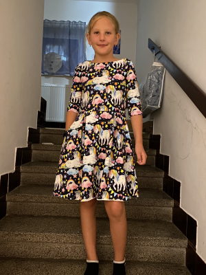 RF: „Môj obľúbený strih v dospeláckej verzii, nuž som musela skúsiť aj tú detskú a to rovno v 2 veľkostiach :) Som nadšená. Aha, áno - predĺžila som rukávy a pridala náplet, kedže to mali byť šaty do školy a škôlky na jeseň-zimu.“