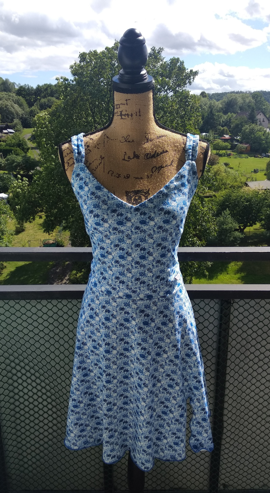 Ivana: „Šaty se šily dobře, už jsem šila druhé. Akorát jsem zašila sklady, připadalo mi, že z téhle látky trochu trčely. Je to trochu silnější materiál, než jsem čekala, ale takhle, myslím, sedí dobře 😊.“