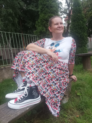 Lucie: „Šití jsem se nejdřív bála, pač jsem si vymyslela jiná záda, ale do finále jsem nadšená. Podle návodu se opět šilo krásně a snadno. Protože bez podprsenky ani ránu 😅, zvolila jsem místo šněrování na zádech žabičkování a z toho důvodu i širší ramínka. Ráda nosím sukně nad kolena, takže moooc chválím zakreslení zkrácené verze sukně již ve střihu👏🏼. Na sukni jsem si dovolila ještě rozparek 😊.“