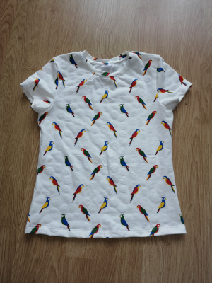 Michaela : „Šilo se to pěkně. Nedržím se návodu. Šiju nejdřív tělo trika, pak ušiju oba rukávy a rovnou je i založím. Pak ty hotové rukávy všívám do průramků. Lépe tak navolním hlavici rukávu do průramků a nemusím při zakládání rukávů manipulovat u stroje celým tričkem.“