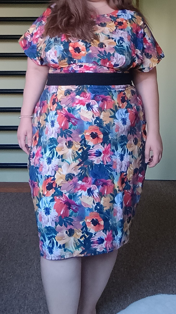 MH: „Tyhle šaty se šijou opravdu dobře (řekla bych, že je to fajn střih pro začátečnice) a rozumím tomu, proč je v návodu několikrát řečeno, že je lepší si nechat větší přídavek a počítat s úpravou. No jo, jenže to bych se do toho nesměla vždycky vrhnout po hlavě. 😀 Šila jsem jich několik a tyhle dopadly nejlíp. Určitě se na ně hodí pevnější úplet, což tenhle je (má 8 % elastanu). Pouzdrou sukni jsem na sebe musela trochu zúžovat. Áčkovou sukni bych naopak potřebovala nahoře trochu zvolnit, ale na to jsem si tam neudělala ten větší přídavek. 😅 Možná budu konfigurovat znova a příště si dám užší rukávy. Mile mě překvapilo, že i já 🍐 můžu mít pouzdrovky. 😁 Díky.“