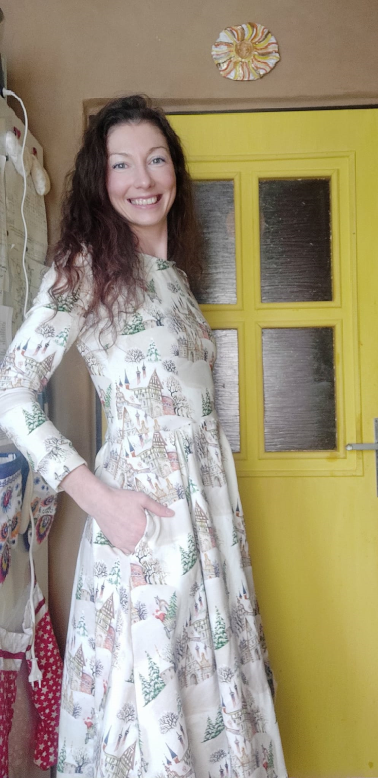 Lucie: „Těchto šatů se nikdy nenabažím😍. Střih je úžasný. Krásně se šijou a jsou moc slušivé. Už jich mám několik a určitě přibudou další. Pro změnu jsem tentokrát zvolila kulatý výstřih. Sukně je opět zkrácená a zadní díl stejně dlouhý jako přední.“