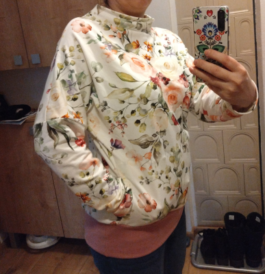 LB: „S mikinou jsem moc spokojená, nařasení límce je opravdu efektní. Přestože bych velikost měla mít spíše 46, riskla jsem šití velikosti 44 a sedí dobře. Je dostatečně volná. Přidala jsem si 2,5 cm v pase a 1,5 cm na bocích pomocí konfigurátoru. A rozhodně není upnutá. Proto jsem zvolila i velmi pružnou teplákovinu. Při šití dávejte pozor na délku zipu, já sama jsem z nepozornosti párala. A pak mne hodně potrápily druky, tak moc, že nemohu funkci zapínání límce využít a jsem ráda, že tam drží bez zapínání. Čili se zaměřte na kvalitu druků co budete používat. Návodové video je velmi dobře zpracované, tak se nebojte si mikinu ušít.“