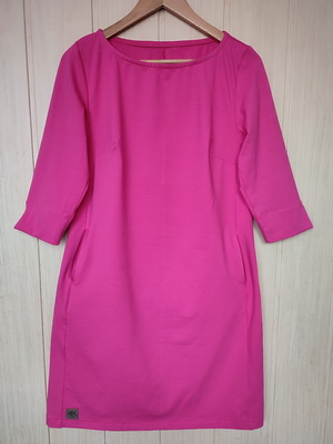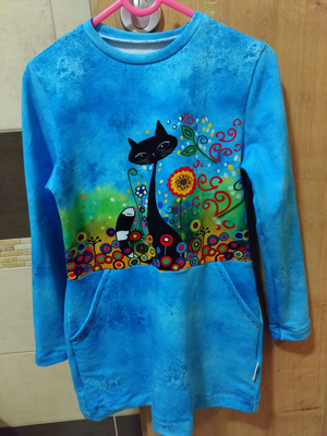 LŠ: „Šaty se šily velmi dobře. Video mi hodně pomohlo. Nakonec jsem šila zadní díl nepřestřižený (stejný jako přední díl). A místo nápletů na rukávu (neměla jsem požitelnou barvu) jsem udělala ze stejné teplákoviny 3/4 rukáv jen z jedné vrstvy. “