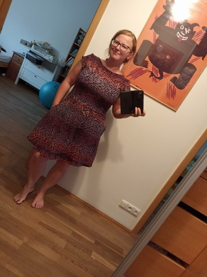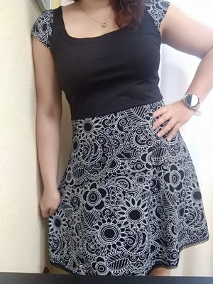 Lucie V.: „Další varianta a opět velká spokojenost. Z důvodu nedostatku černé látky jsem si musela pohrát s horním dílem (u rukávů a po stranách jsem musela nastavovat vzorovanou). Výstřih na zádech jsem použila na přední díl a vypadá to úžasně, výstřih je tak akorát.“