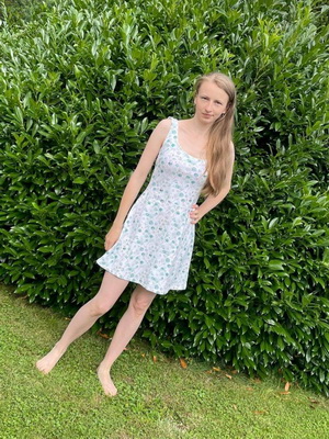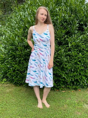 Jofiel: „Moc povedený střih a vzešly z něj parádní letní šaty! Jelikož mám dost netypickou postavu (žádná prsa, žádný pas 🤭😂), vršek jsem si poupravovala na vel. 40/42, spodek je 42. Nicméně trošku jsem to přestřelila, čistá 40 by v pohodě stačila. Sukni jsem střihla přesně na délku delší sukně (bez přídavku na záložku) a zahla o 3cm. Moc děkuji za super střih ❤️“