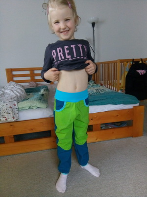 hanka.de.rana: „Ještě nikdy jsem nešila kalhoty z tolika dílů :) Aspoň jsem spotřebovala zbytky a prostřihy. Šilo se hezky, vše sedělo jak má. A hlavně kalhoty pěkně pasují! Libí se, M se v nich volně hýbe,nikde neškrtí a vypadají skvěle! Šila jsem podle fotonávodu, někde jsem si nebyla jistá, tak jsem nakonec hledala upřesnění ve videu. Určitě budou další.“