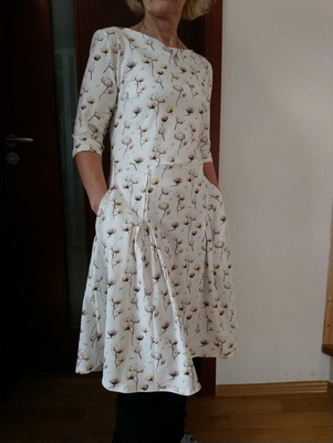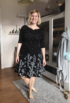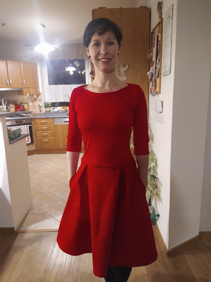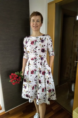 Ladi: „Moc pekny strih, saty se sily paradne, moc se mi libi hlavne uprava vrchni casti - pekne podtrhuje zenske krivky. Na mem obrazku neni sukne zcela podle puvodniho strihu: protoze jsem nemela dostatek latky, musela jsem vynechat sklady. Ale to je kouzlo dobreho strihu - umoznuje spoustu drobnych variaci pri kazdem siti. A diky za video - vizual celeho procesu je neocenitelny 👍.“